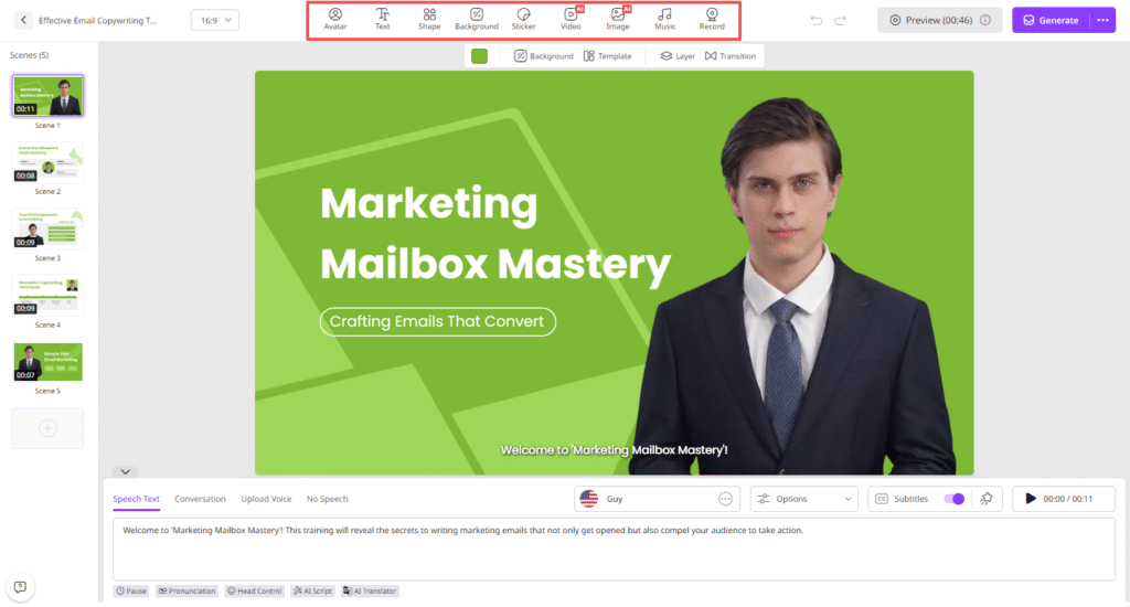 • Use the Online Video Editor to customize an AI video. It enables users to alter the background, add music, and more.