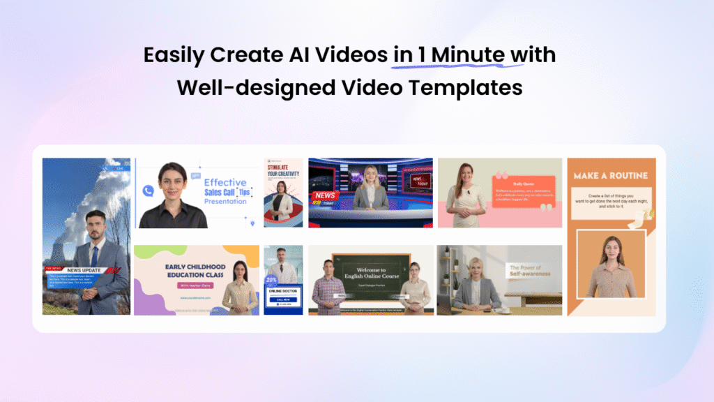 1. Customizable Video Templates: Vidnoz AI offers 2800+ video templates, allowing L&D teams to create various types of training videos at a fraction of the time of traditional production. With the help of this tool, users can produce videos such as how-to guides, training, educational, tutorials, product demos, and more. Further, users can also create custom templates from scratch.